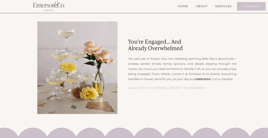 “You said yes to forever, but now… feels like a second job” → “everything handled in-house… celebration, not a checklist”—instant empathy + CTA.
