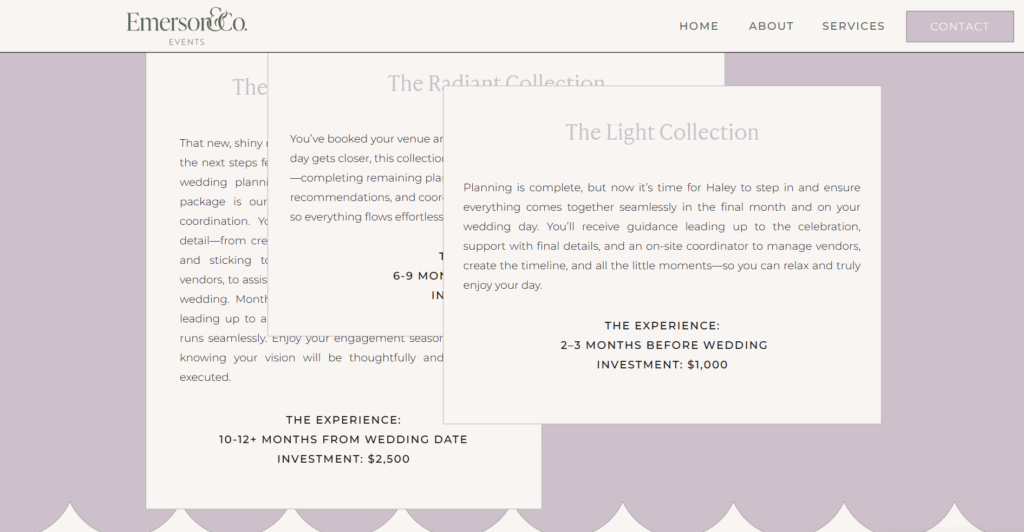 Emerson & Co Events showcases a seamless Brand Sprint-to-full Build transformation for Haley’s wedding planning business. I am so obsessed that Haley and I got to reconnect this year finally, since our sorority days back in college!! This project was so fun and I am sorry, not sorry to say Haley may be my favorite client to date. She is supportive, trusting, and really so passionate about what she does and it shows! Listening to her talk about her business and watching her face just LIGHT UP is such a serotonin booster. I’m obsessed with her new branding, and guys, she keeps coming back for more!! I can’t wait to continue to support her journey for however long she’ll let me 💙